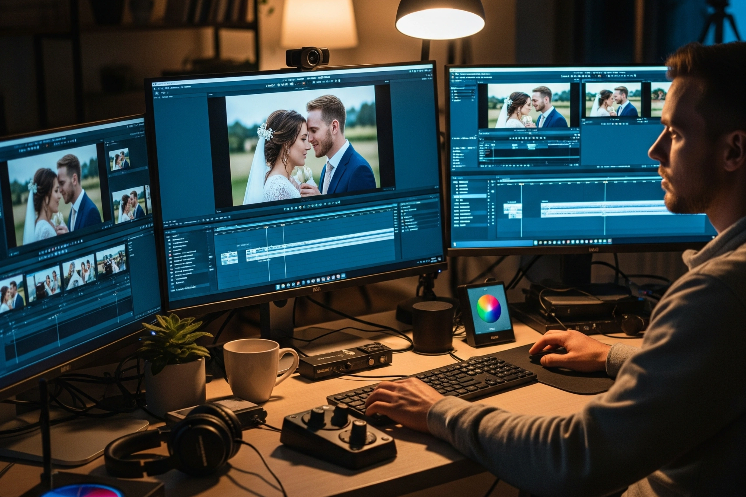 A wedding video editor makes a seamless cinematic wedding film by organizing raw footage, enhancing visuals with color grading, synchronizing audio with music and vows, and so on.